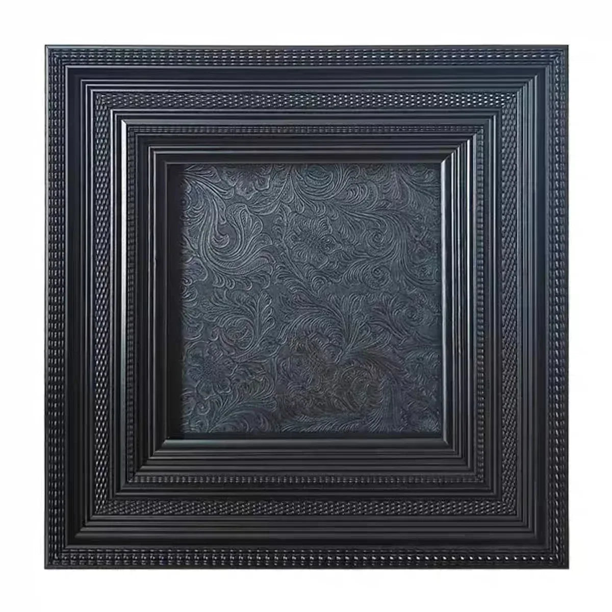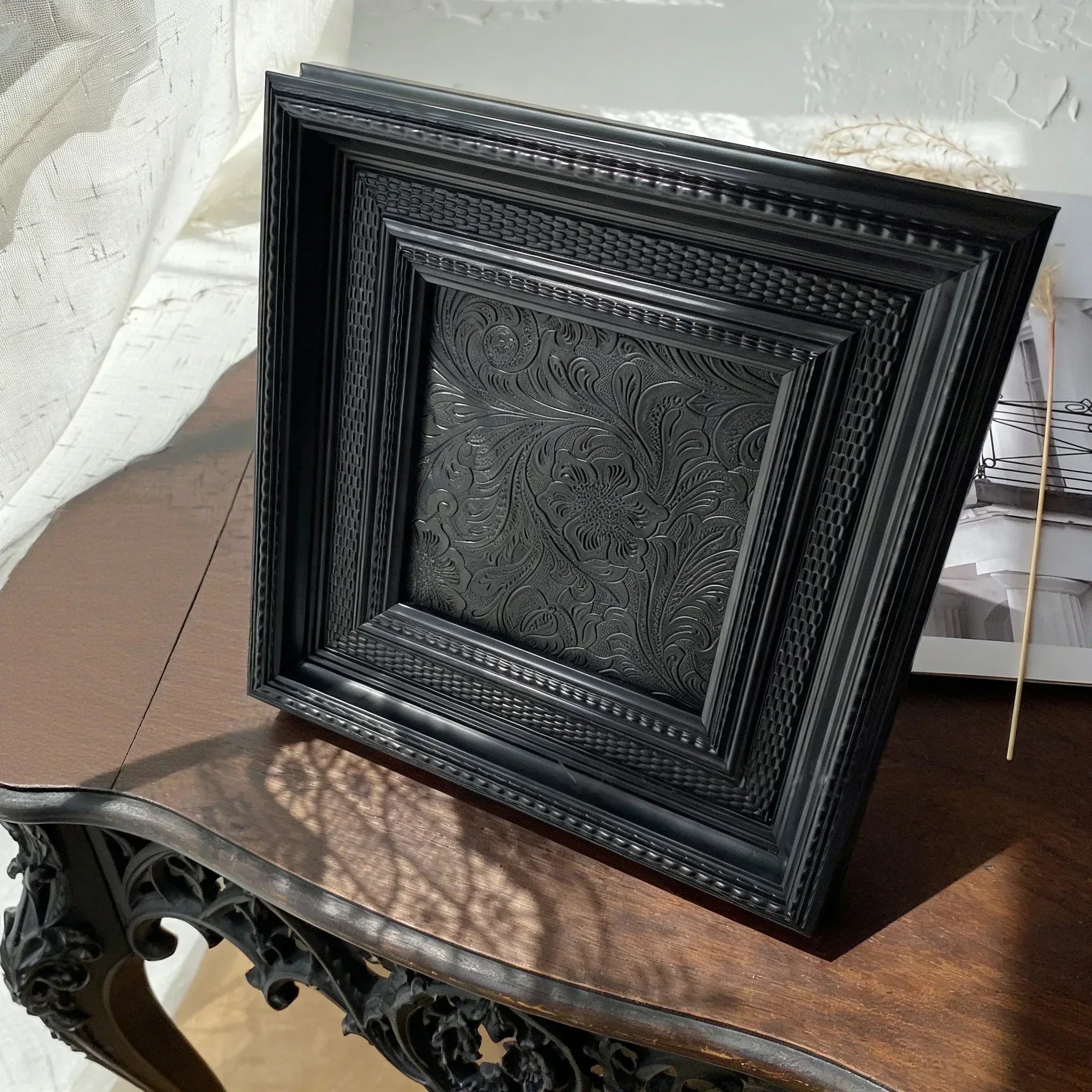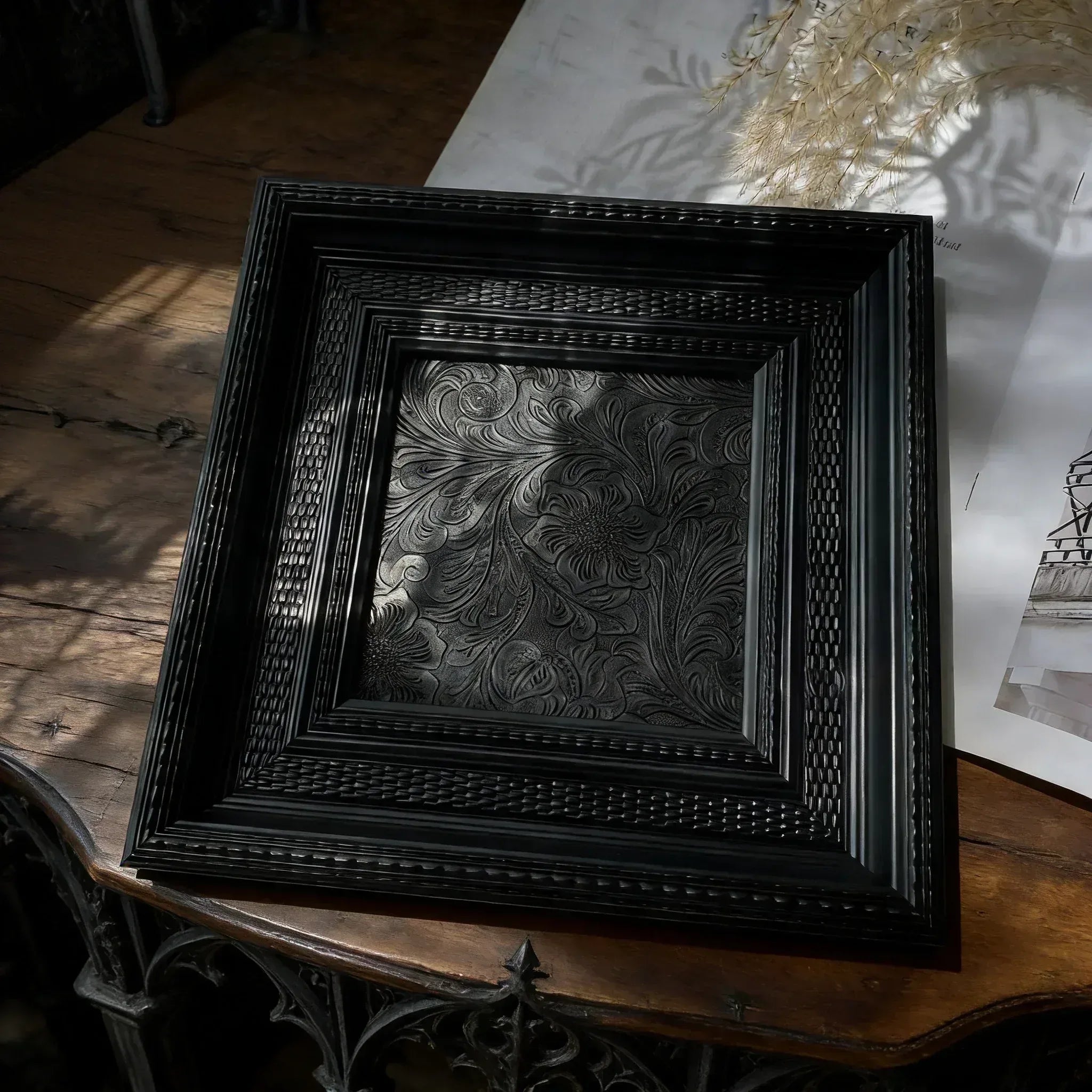 This Black Reliquary Gothic Frame features a finely detailed black floral pattern that evokes the essence of a dark, gothic garden. The frame's intricate dot-patterned carvings add depth and texture, making it a striking piece for any gothic home decor. With a sturdy backing and support stand, this frame is perfect for showcasing your most cherished photos or dark animal specimens. Its bold design and rich black finish make it an ideal addition to any room seeking a touch of the occult style.