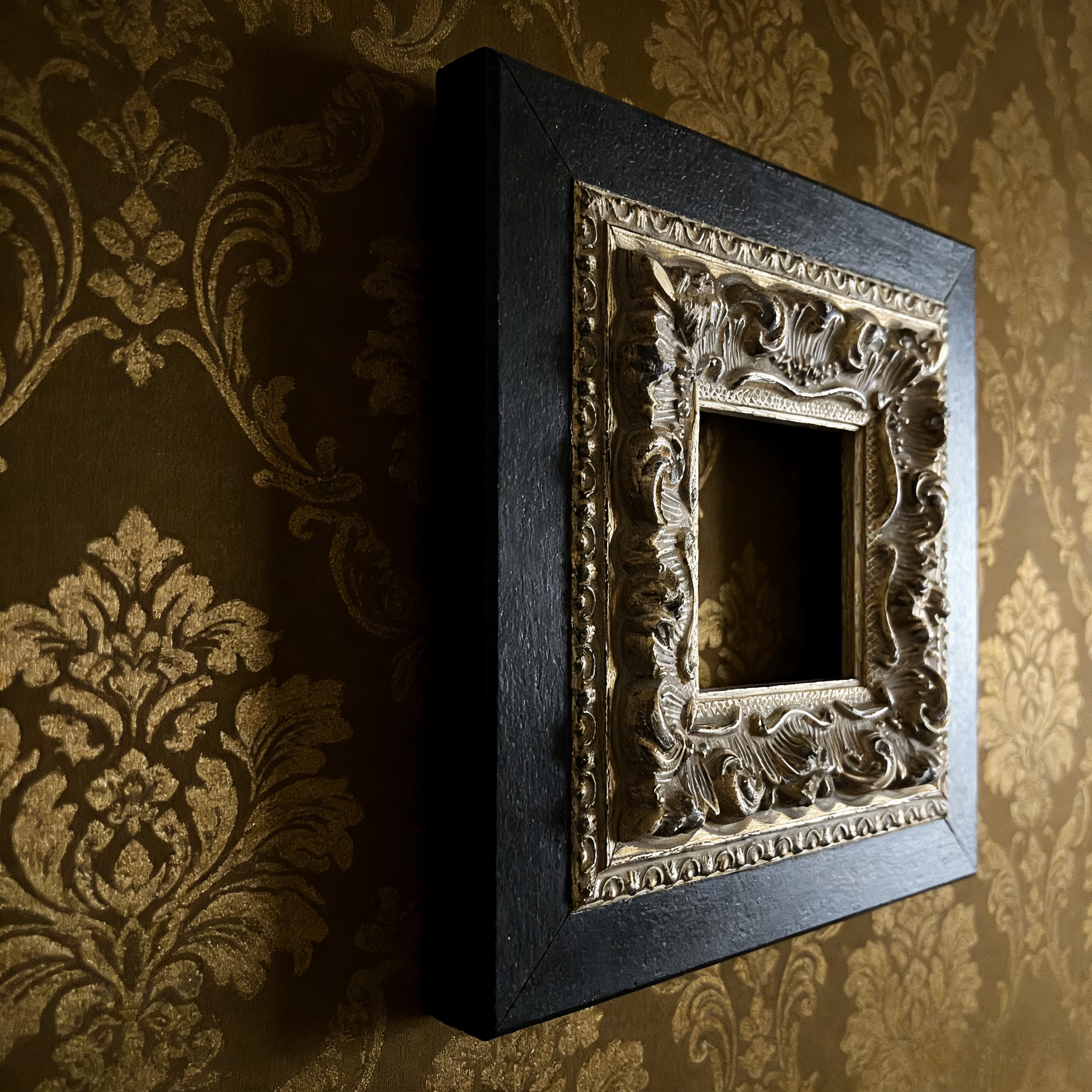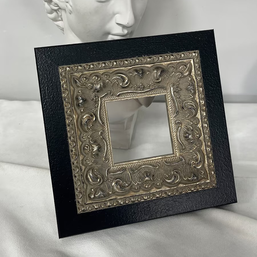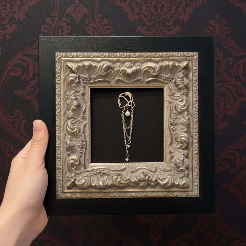 This Victorian Silver Carved Wood Frame features a striking black solid wood outer edge, complemented by an intricately detailed silver floral border. The frame's vintage design is perfect for showcasing your favorite artwork or photographs, adding a touch of gothic elegance to any room. With its acrylic front and sturdy backing, this frame is both functional and stylish, making it an ideal addition to your gothic home decor.
